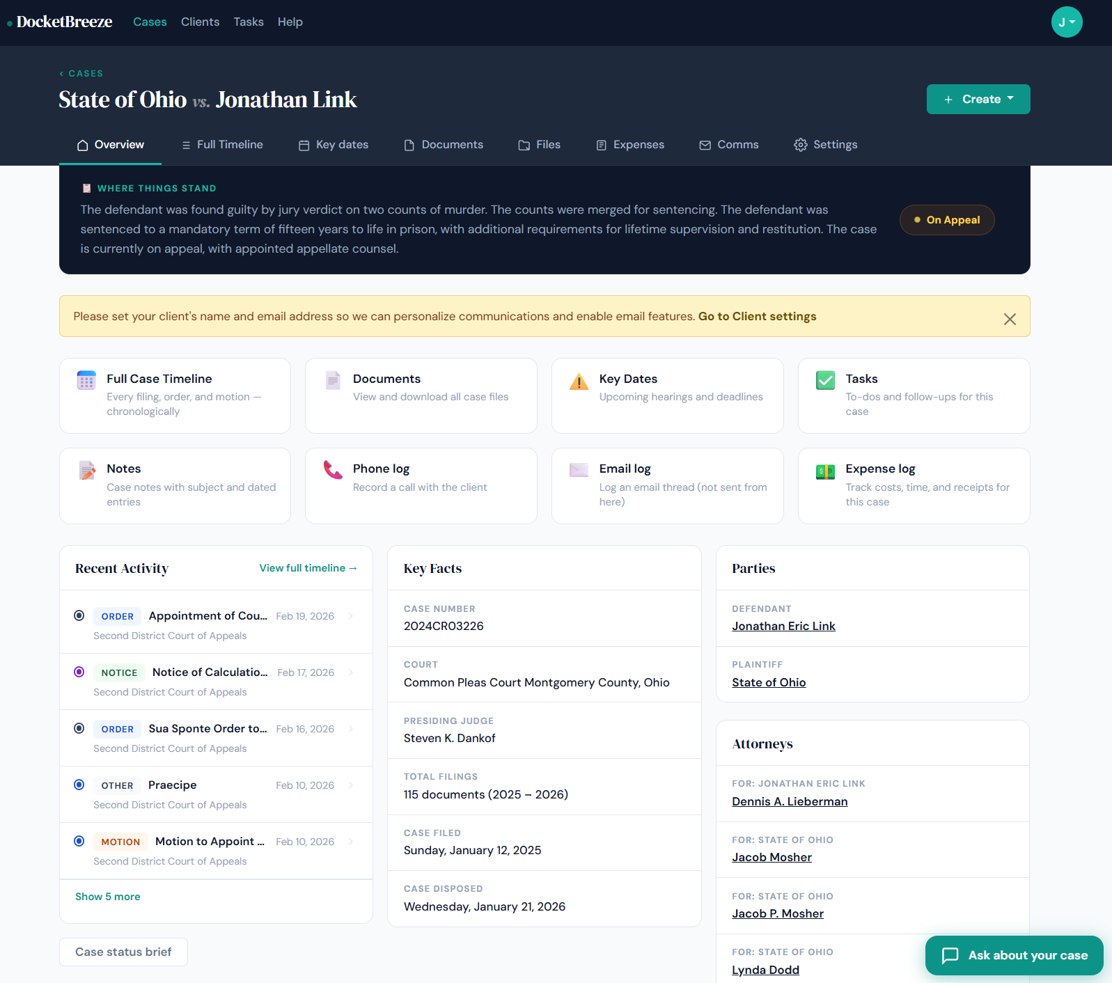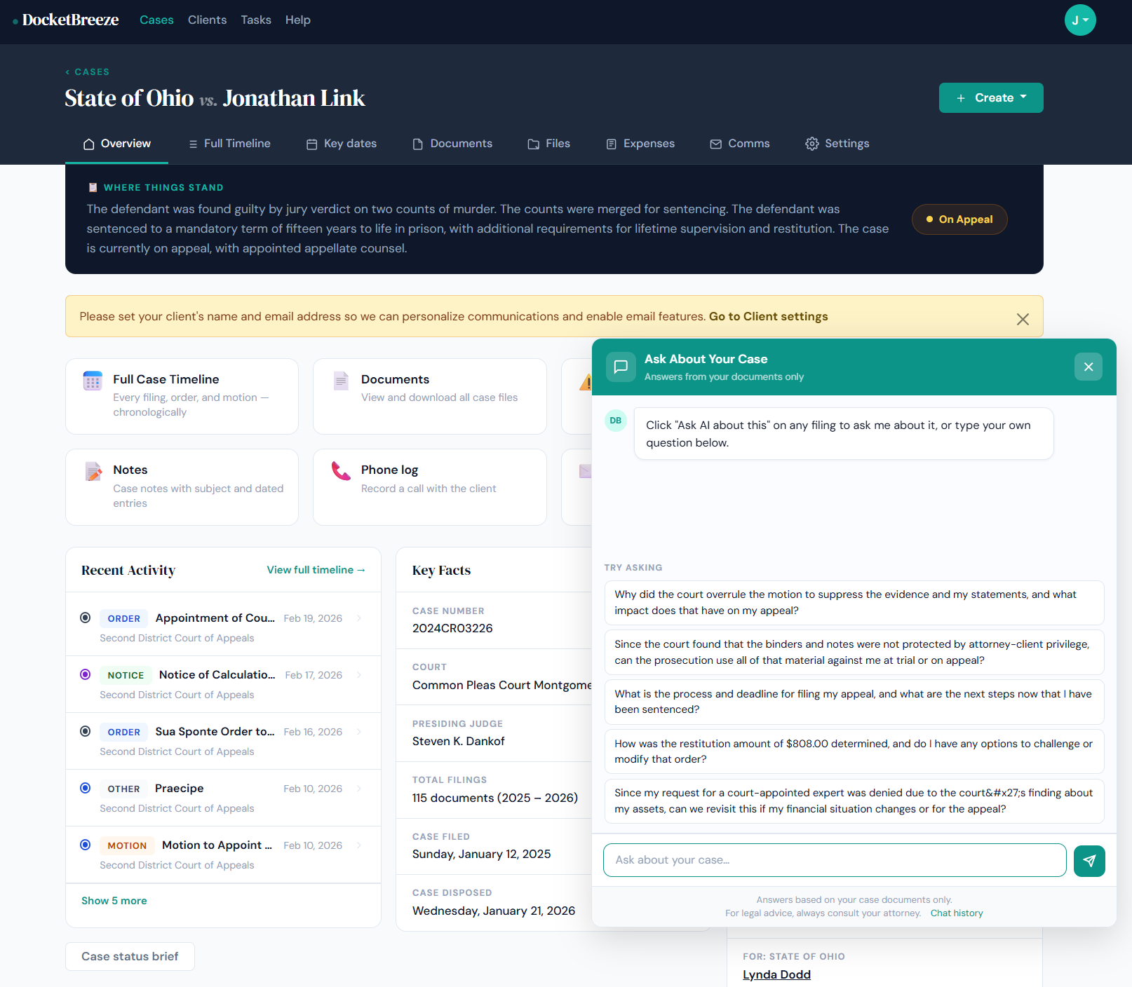 Ready to let your clients get answers without the phone tag? Sign up at docketbreeze.ai and see Ask About Your Case in action.