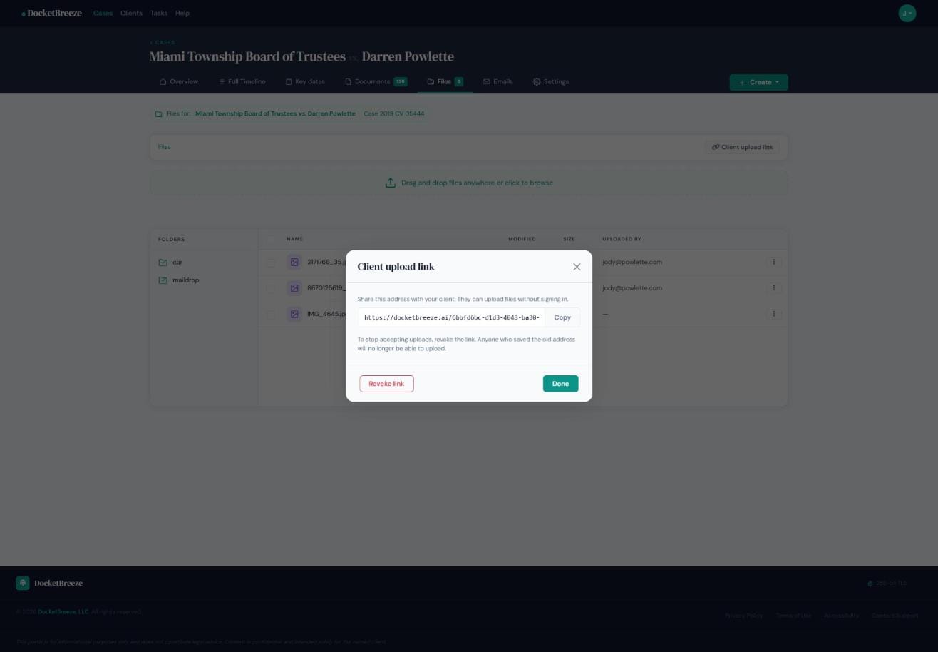 Click the "Client upload link" button in the top right of the Files area. A secure, unique URL appears — copy it and send it to your client via any channel. They visit the link, upload files directly into your case, and never need a DocketBreeze account. When you want to stop accepting uploads — when the matter closes, for example — click "Revoke link" and the URL stops working immediately.