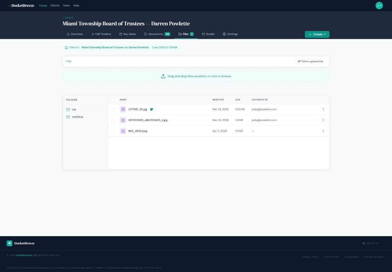 Every legal matter has two kinds of documents: the official docket filings, and everything else — the car photos, medical bills, contracts, and photos that tell the rest of the story. DocketBreeze keeps these separate and organized. And by letting clients upload materials directly via a secure link, you eliminate the email chain of attachments and the risk of documents landing in the wrong folder. The client upload link is particularly powerful because there's no friction for the client — they don't need to log in or create an account, yet every file lands exactly where it belongs.